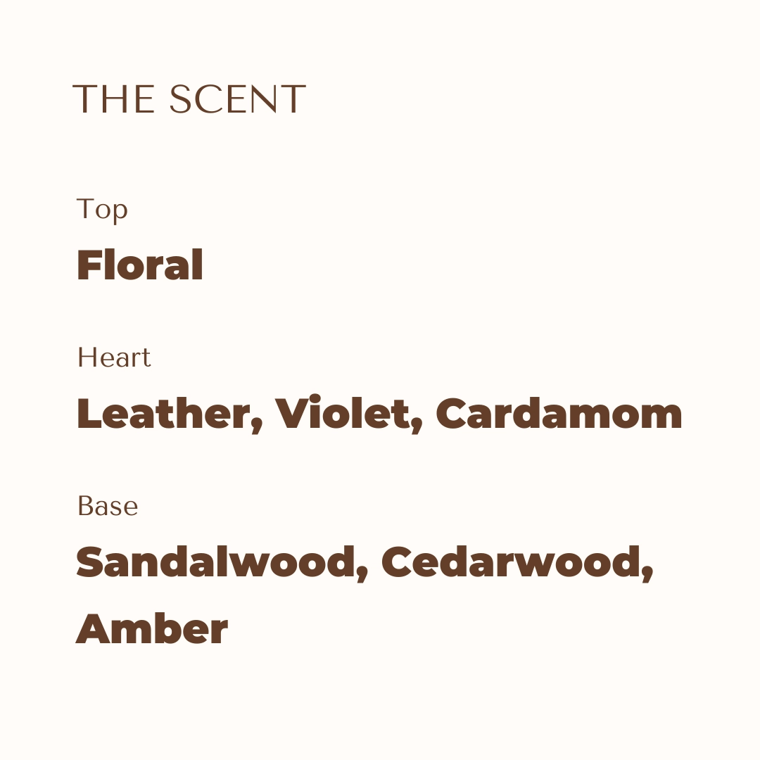 • Bloemige opening & kruidig hart – met violet, leer en kardemom