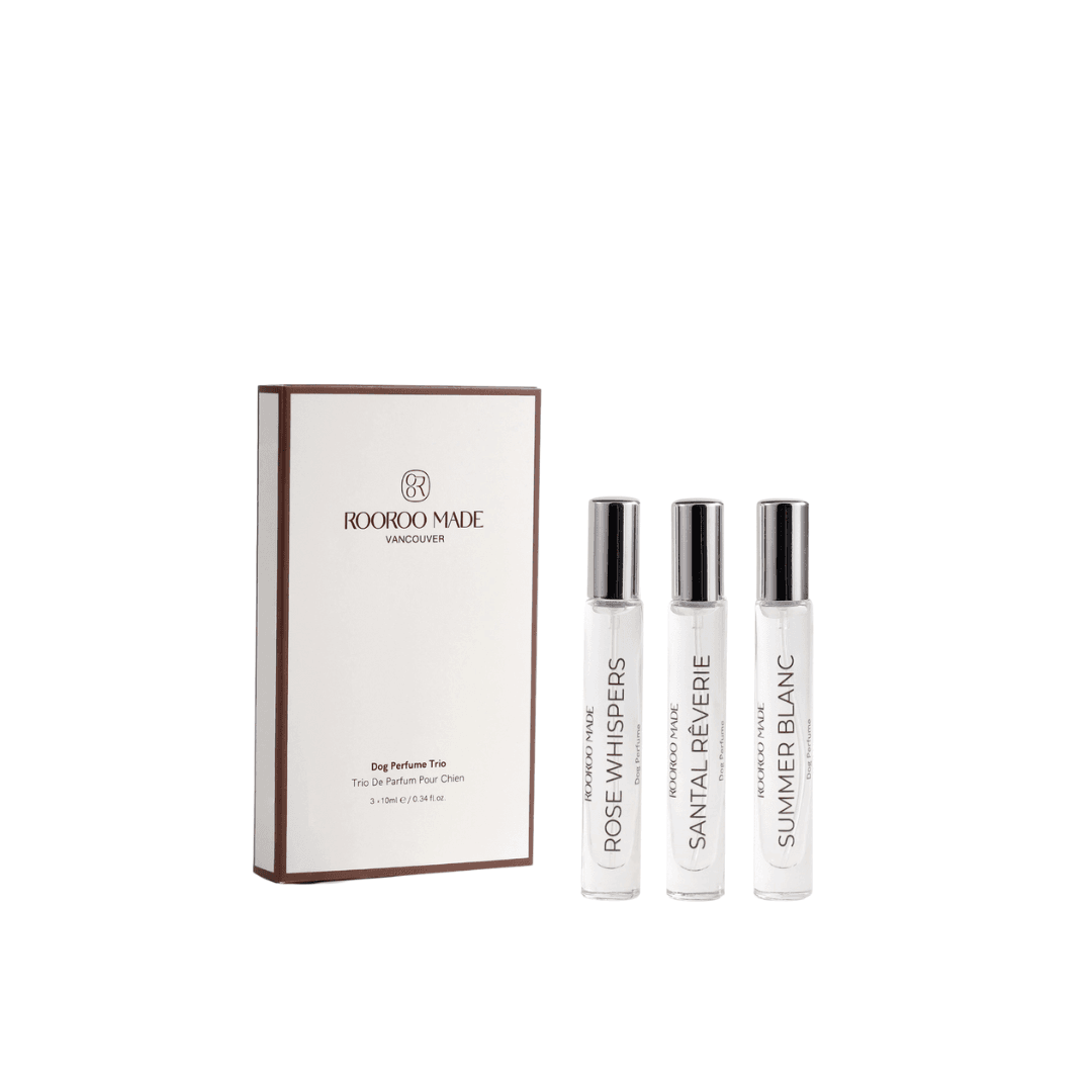 Drie keer verwennerij in één set. Ontdek het ROOROO MADE parfum trio: een stijlvolle set met drie handgemaakte hondenparfums in handige 10 ml flacons. Perfect om de geuren uit te proberen, af te wisselen of cadeau te doen! Elk flesje is gevuld met een unieke geurbeleving, met zorgvuldig gekozen ingrediënten die veilig en alcoholvrij zijn – speciaal voor honden. Laat je hond stralen met florale frisheid, fruitige elegantie of warme houttonen, allemaal met liefde gecreëerd in Vancouver, Canada.